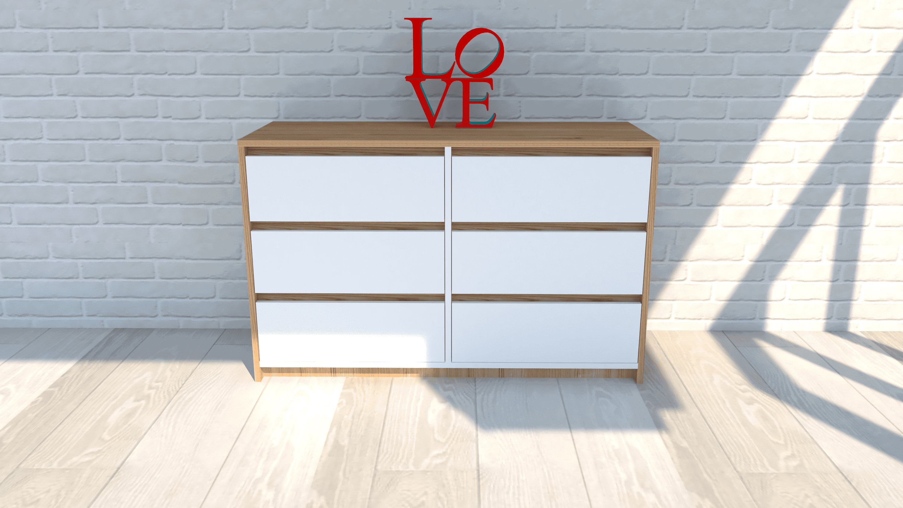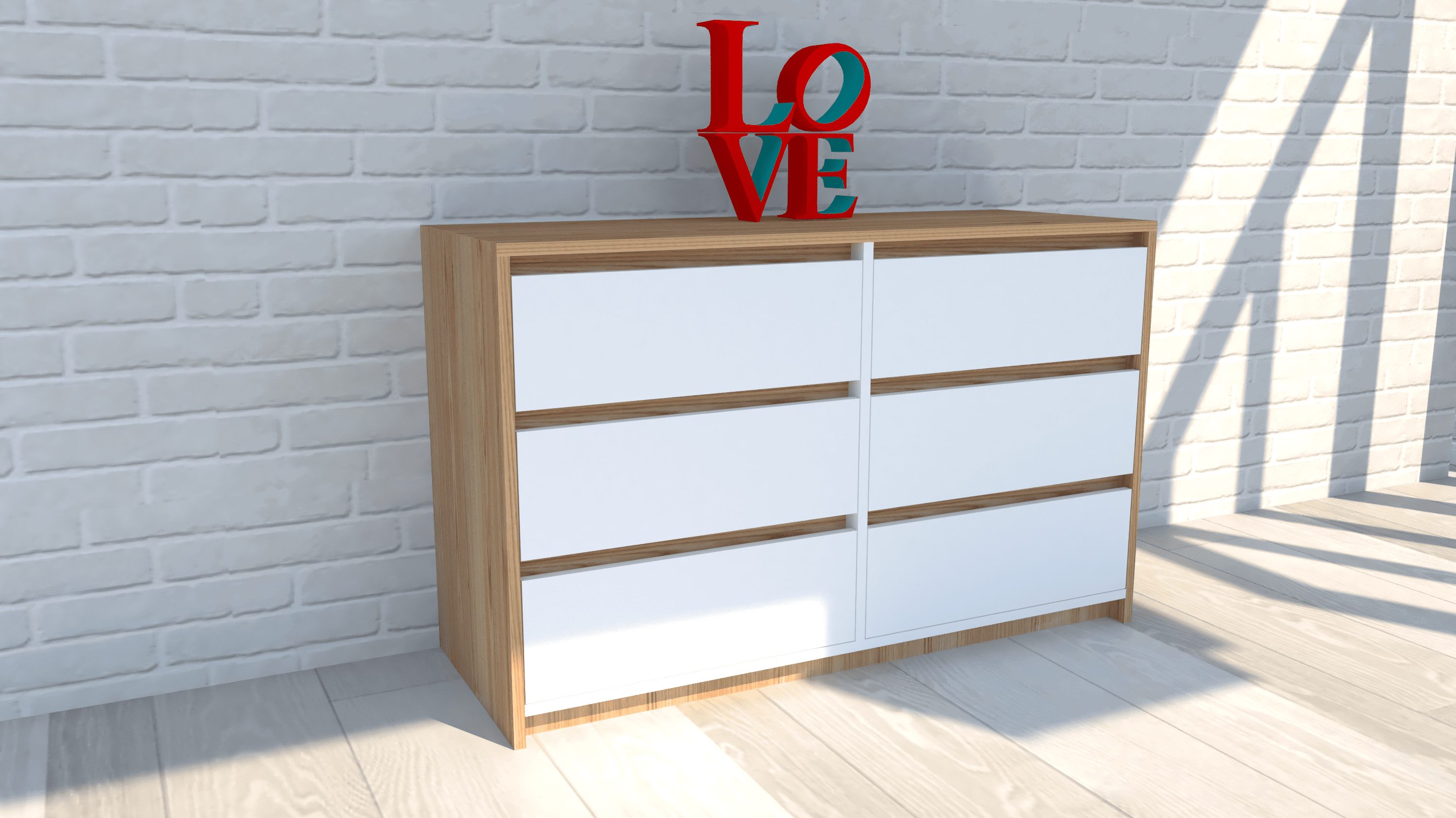 Materiales: Melamina de 18 mm sobre mdf en color blanco/combinado con enchapado en paraíso(protegido con laca poliuretano)