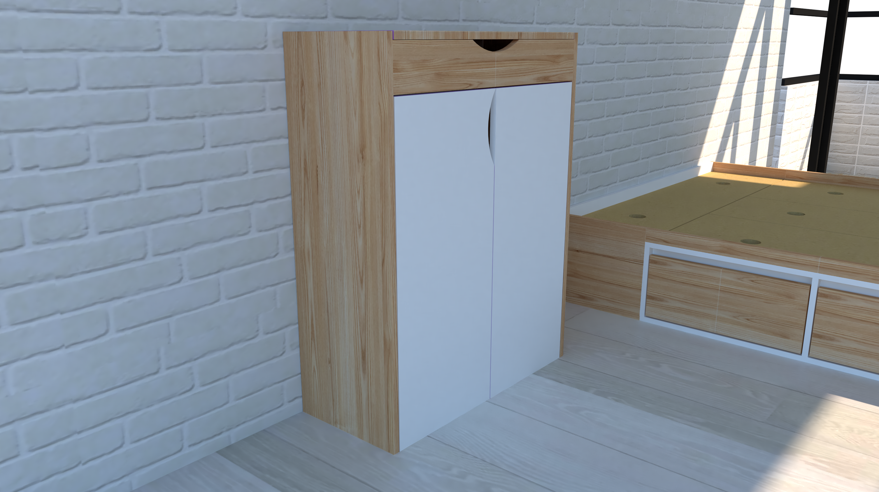 Materiales: Melamina de 18 mm sobre mdf en color blanco combinado con enchapado en paraíso(protegido con laca poliuretano)